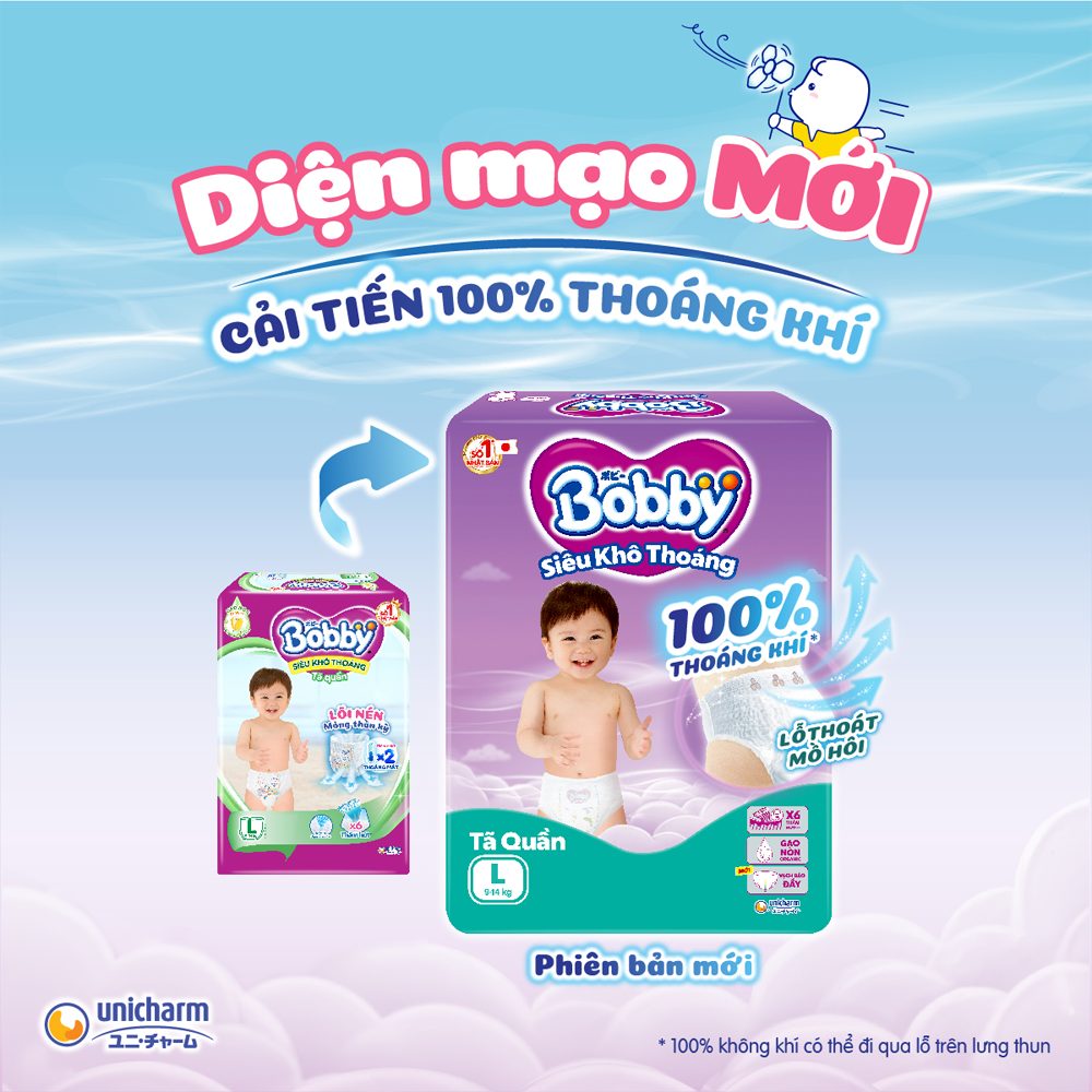 Tã quần Bobby siêu khô thoáng Ultra+ chiết xuất GẠO NON với bề mặt đệm lưng được cải tiến mới có hơn 3000 lỗ thông khí, giúp tã nhanh thấm, cho bé cảm giác thoáng mát.