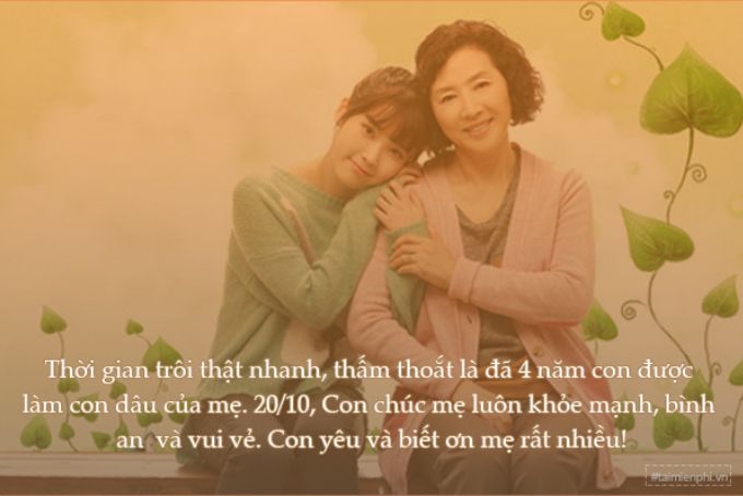 4. Mẹ à! Con luôn thấy mình may mắn vì được làm con dâu của mẹ. Nhân ngày ngày 20/10, con chúc mẹ luôn bình an, hạnh phúc và có thật nhiều sức khỏe. Con cám ơn mẹ vì đã luôn yêu thương và đối xử tốt với con! Con yêu mẹ!