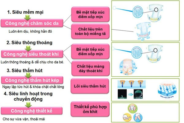 . Siêu thấm hút: thiết kế chống tràn khóa chặt chất lỏng đến 6-8 tiếng và không vón cục. Các hạt thấm hút kép cùng với bề mặt tiếp xúc điểm xốp mịn tạo ra những khoảng trống giúp thấm chất lỏng cực nhanh và không bị lan ra khắp bề mặt tã.