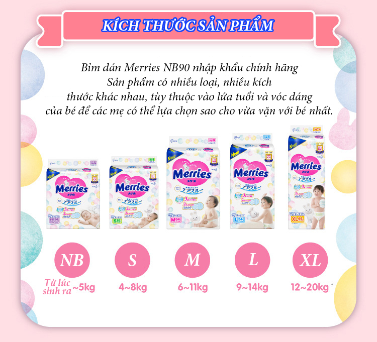 Hiện nay, bỉm Merries có nhiều kích thước phù hợp cho các bé từ sơ sinh, bỉm tã Merries cho bé trên 16kg đến 28 kg từ bỉm Merries size NB đến bỉm Merries size S, bỉm Merries size M, bỉm Merries size L, thậm chí lên đến size XXL.