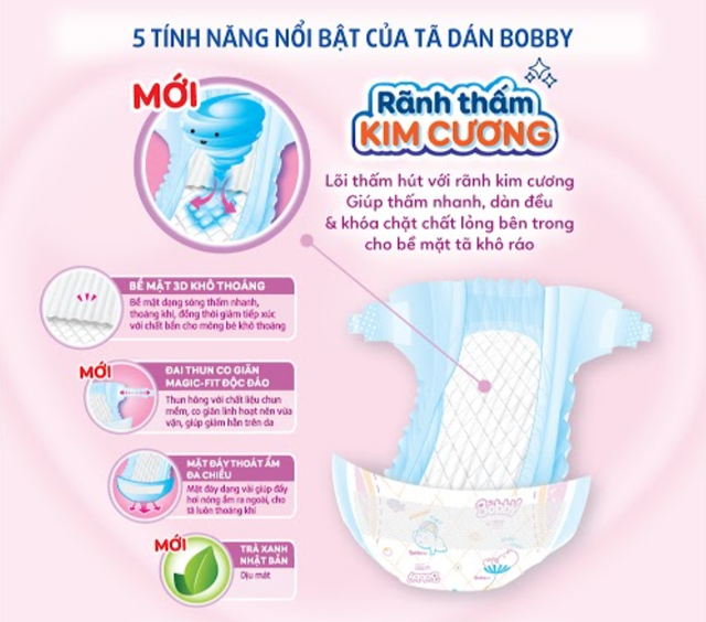 Tã dán Bobby siêu thấm - khô thoáng êm mềm khô thoáng cải tiến mới với cấu tạo bề mặt đột phá hơn 4,000 lỗ thấm hút siêu nhanh, thoáng khí hơn gấp 2 lần, cùng chất liệu Cotton-soft bổ sung Cream Vitamin E dịu nhẹ, ngừa hăm, tốt nhất cho làn da non nớt của trẻ sơ sinh.