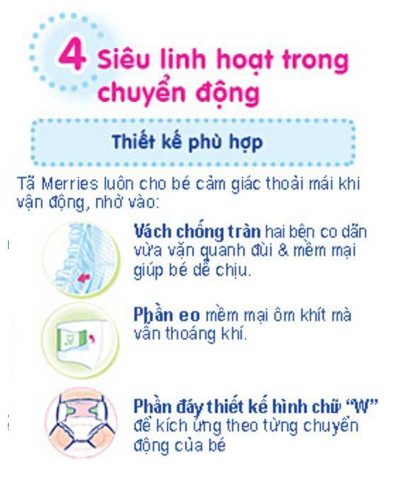 - Merries sử dụng thun chân co giãn siêu mềm mại, siêu linh hoạt, chuyển động theo từng cử động nhỏ nhất của bé, tạo nên vách chống tràn êm dịu ôm khít quanh đùi giúp chống tràn tối ưu.