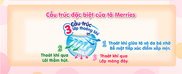 Công nghệ đệm khí siêu mềm cao cấp đến từ Nhật Bản mang tới cho từng miếng tã Merries bề mặt tiếp xúc điểm mềm mại hơn, thông thoáng hơn và thấm hút nhanh hơn, giúp giảm lượng ẩm ướt trên da bé, từ đó hạn chế tối đa việc hăm tã. Đặc biệt với size NB và S, từng đệm khí được tăng thêm gấp 3 lần thể tích khí, cho bé sơ sinh cảm giác êm ái và nâng niu nhẹ nhàng.