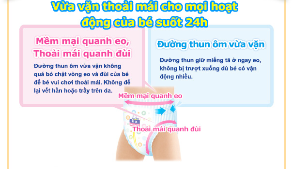 - Lưng thun quanh eo có các rãnh thông khí độc đáo vừa tạo nên lớp chống tràn, vừa tạo khoảng cách với da, giúp bé thoát khỏi cảm giác ẩm ướt ngay cả khi vận động nhiều.