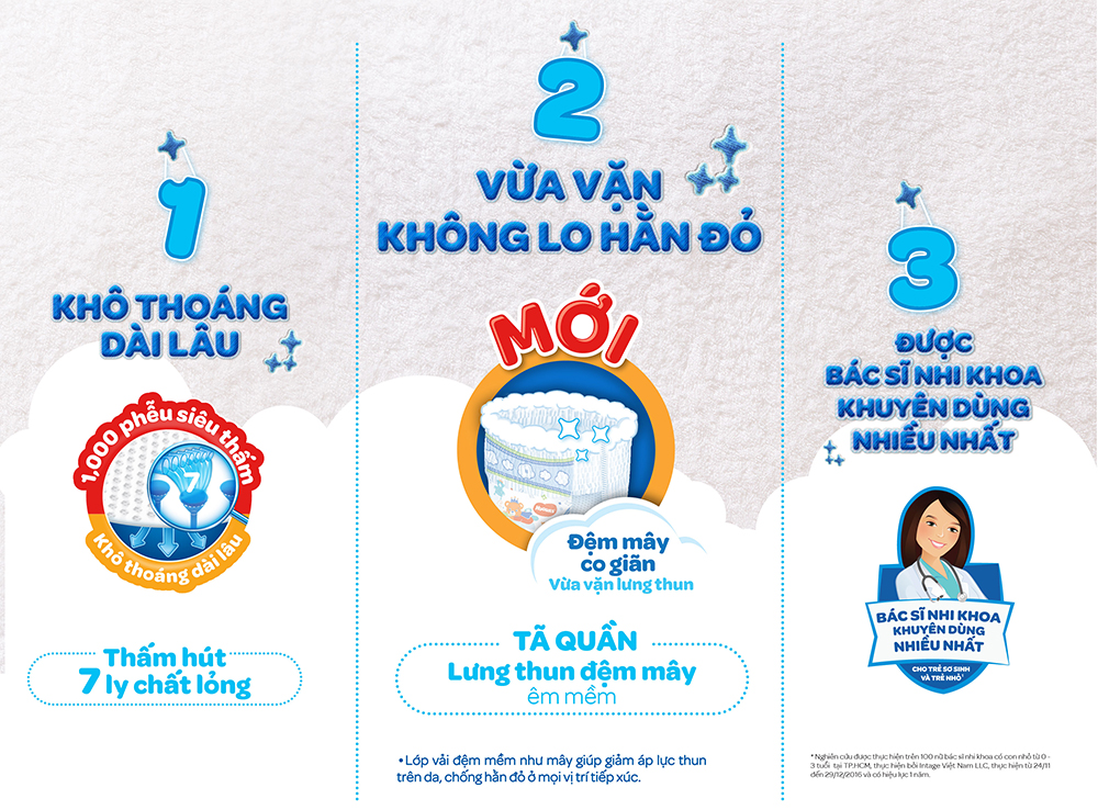 - Thế hệ tã mới cải tiến mỏng hơn và thấm hút đến 7 ly chất lỏng, giúp da bé khô thoáng dài lâu.