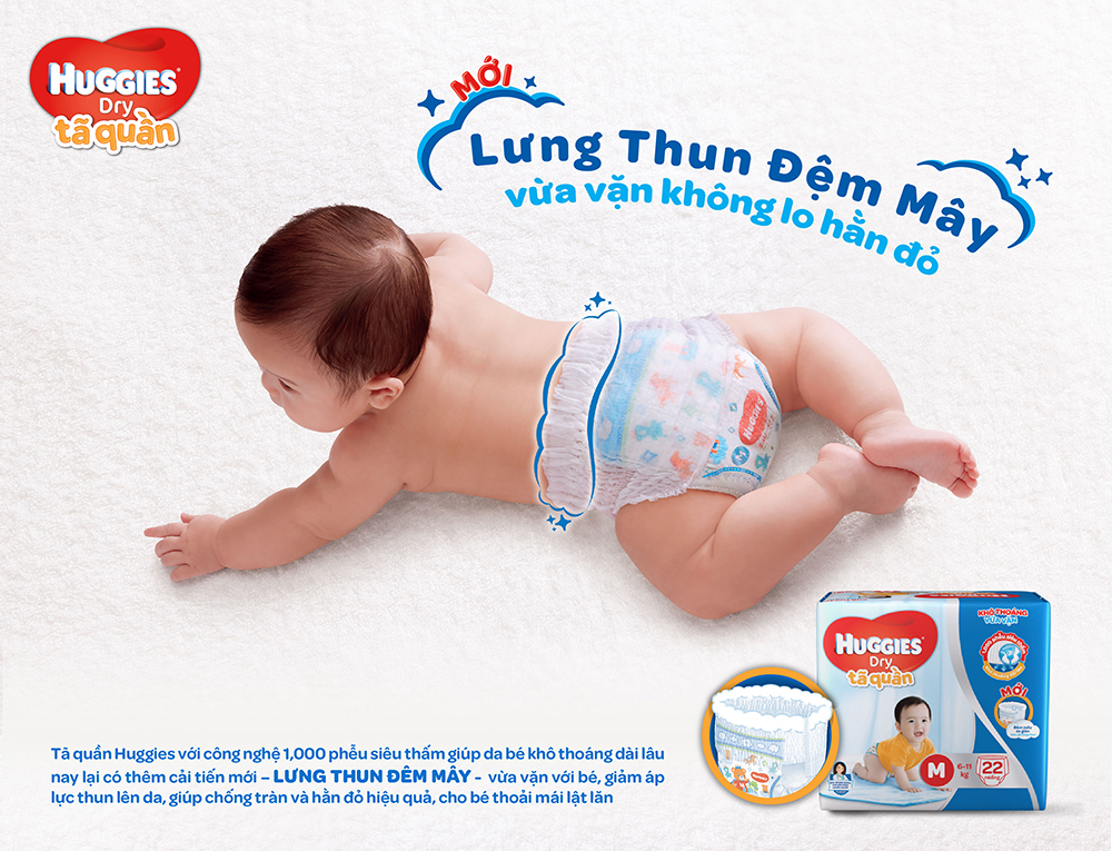 Cải tiến mới đến từ Huggies với đệm mây êm ái, mỏng nhẹ kết hợp cùng lưng thun co giãn đến 2 lần, thoải mái vừa vặn ôm lấy mông và bụng bé, giúp bé thoải mái chuyển động mà không lo hằn đỏ.