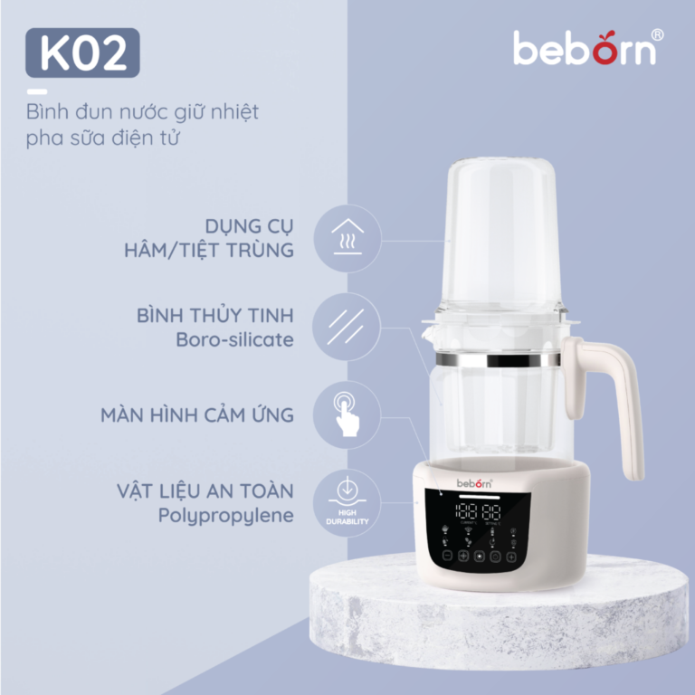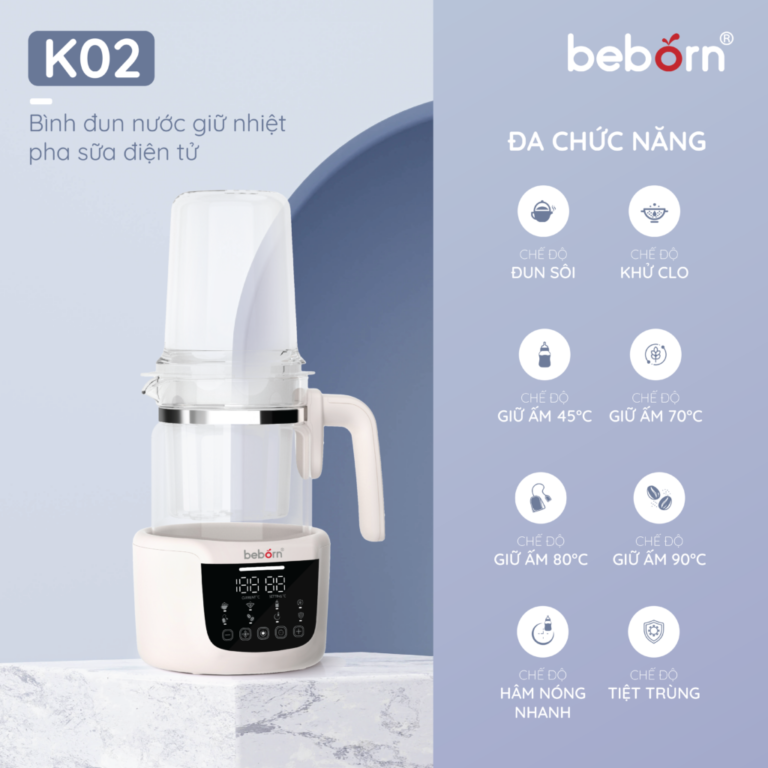 Bình đun nước giữ nhiệt Beborn là trợ thủ đắc lực giúp mẹ làm việc không quản ngày đêm, không hề biết mệt. Để giúp đỡ các mẹ bỉm sữa nhiều hơn nữa, Beborn đã đưa thêm vào K02 hai chức năng mới (mà một số bình đun nước thông thường không có):