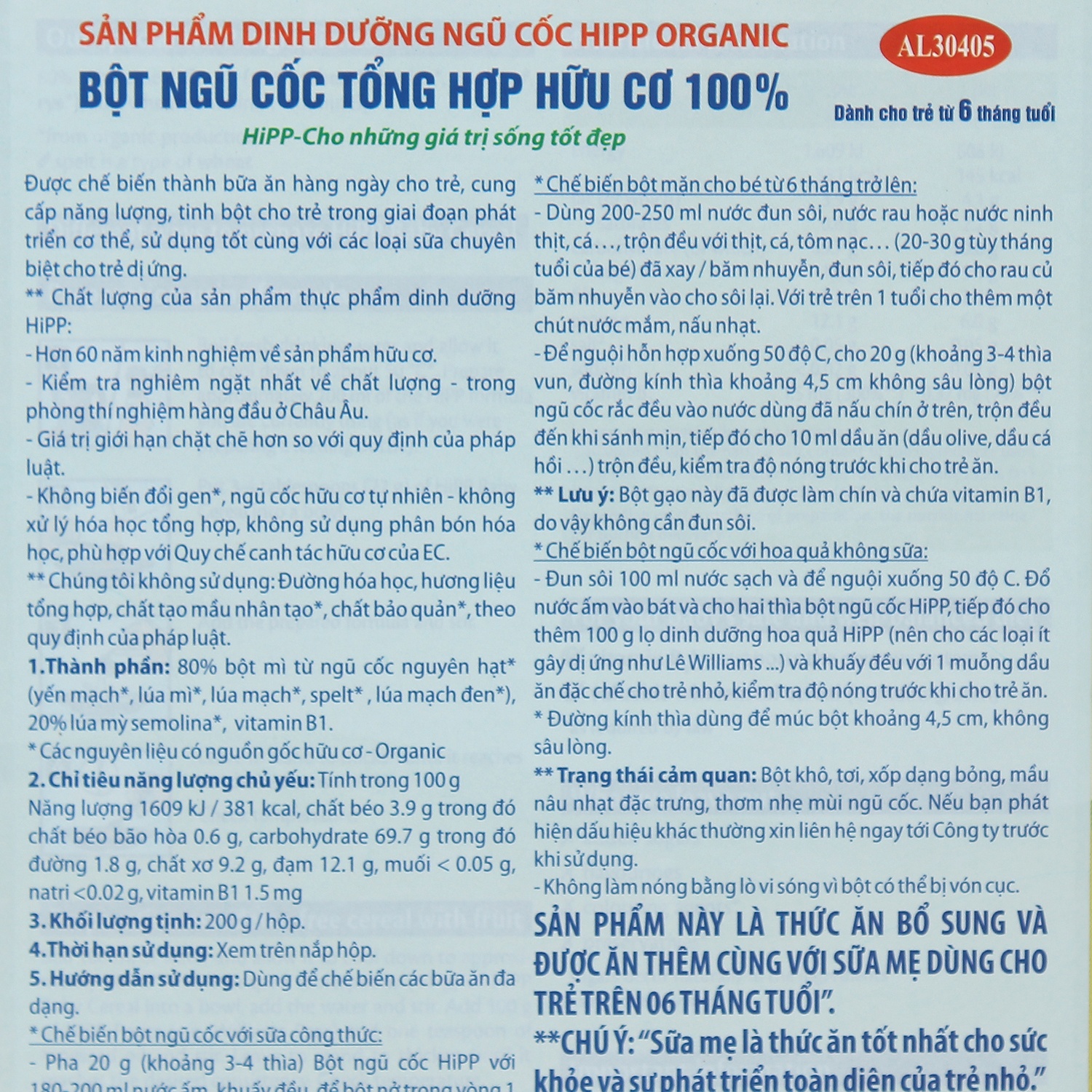 - Bột ăn dặm Hipp ngũ cốc sau khi mở nắp hộp chỉ có giá trị sử dụng trong vòng 4 tuần