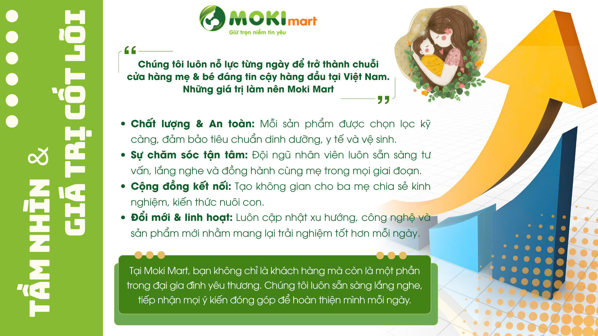 Chúng tôi luôn nỗ lực từng ngày để trở thành chuỗi cửa hàng mẹ & bé đáng tin cậy hàng đầu tại Việt Nam. Những giá trị làm nên Moki Mart:
