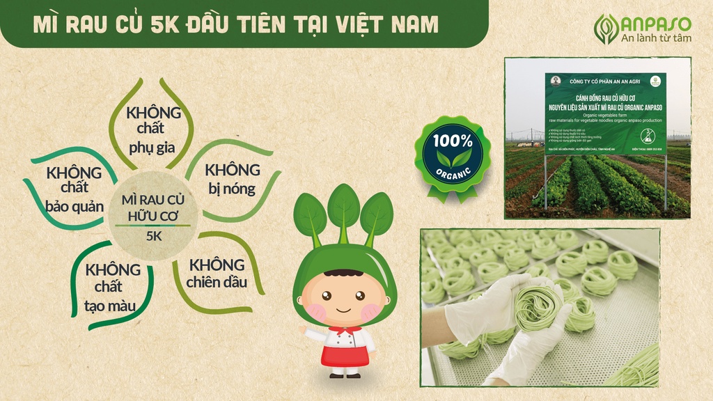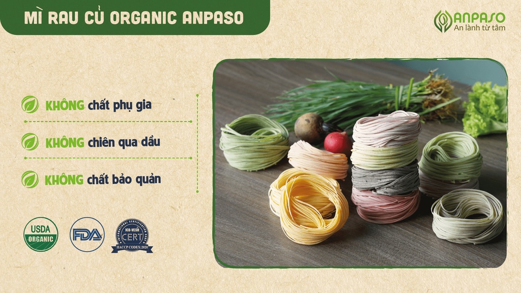 - Sạch: Mì ăn dặm cho bé Anpaso đạt chuẩn Organic được tuyển chọn kỹ lưỡng từ khâu hạt giống, gieo trồng, thu hái & chế biến.