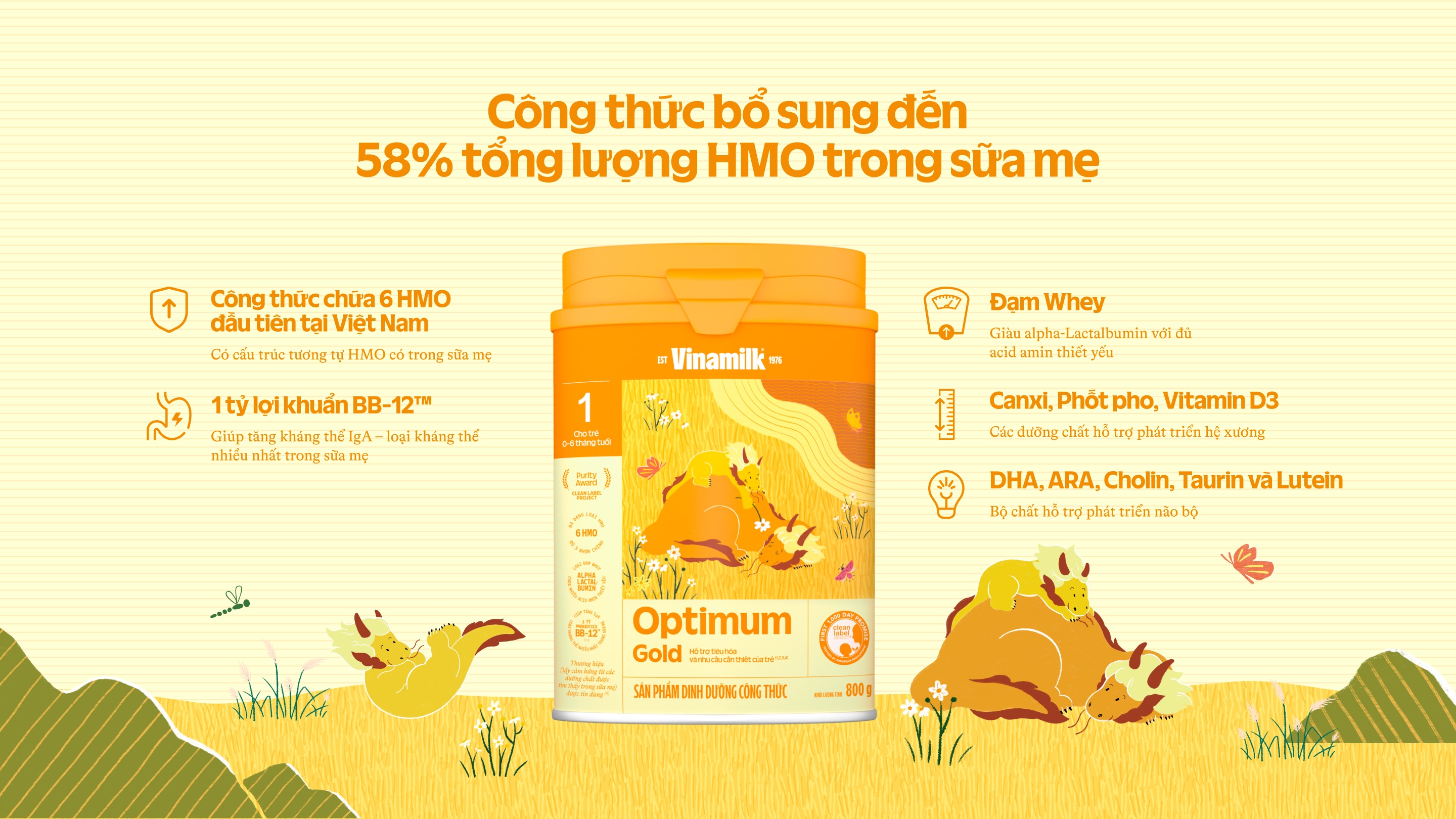 Thành phần nổi bật của Optimum Gold gồm DHA, Lutein và Choline giúp hỗ trợ phát triển não bộ và thị giác, tăng khả năng ghi nhớ và tập trung. Chất xơ hòa tan FOS và hệ men vi sinh BB-12™ cùng LGG™ giúp cải thiện hệ tiêu hóa, giảm táo bón và giúp bé hấp thu dinh dưỡng tốt hơn. Ngoài ra, sữa còn bổ sung canxi, vitamin D, kẽm và các khoáng chất thiết yếu, giúp bé phát triển chiều cao, xương và răng chắc khỏe.