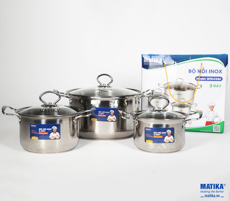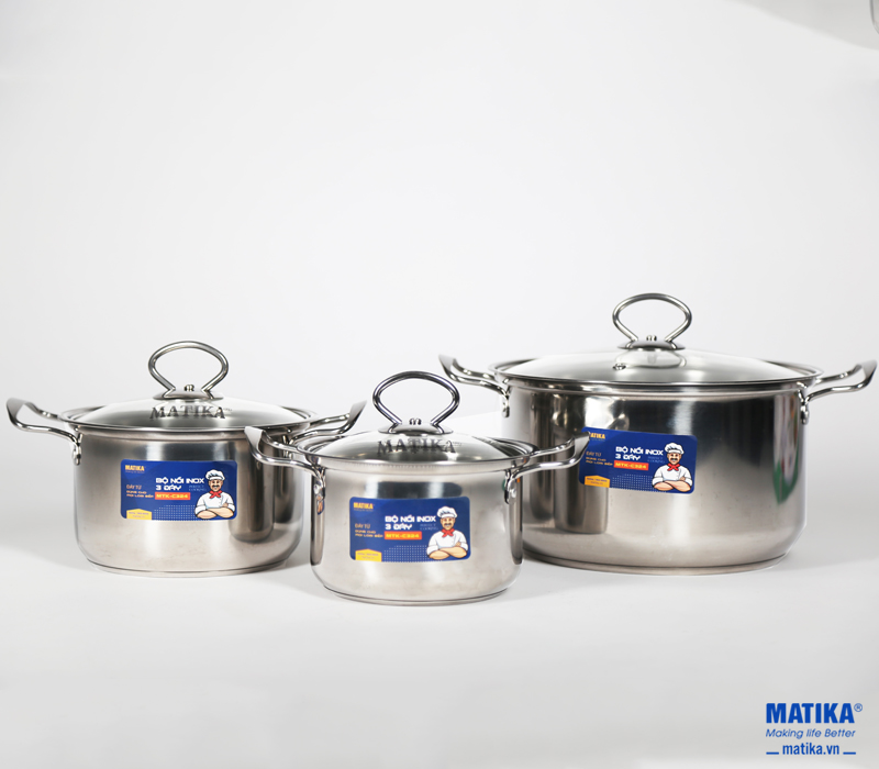 - Nồi inox 3 đáy Matika MTK-C324 gồm bộ 3 nồi với kích thước khác nhau 18 – 20 – 24cm giúp người dùng linh hoạt sử dụng cho từng món ăn khác nhau vô cùng tiện lợi.