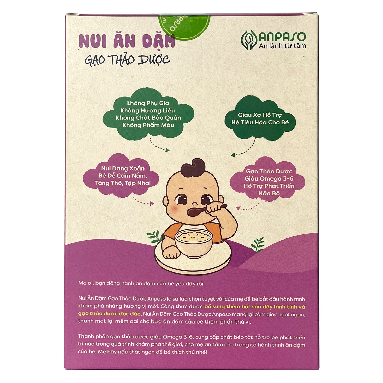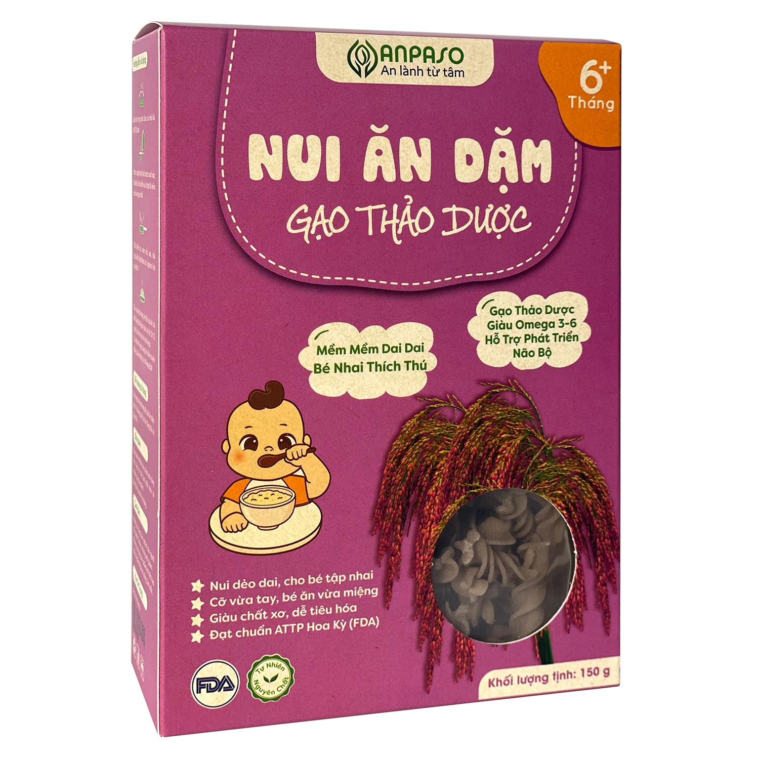 Nui ăn dặm cho bé Anpaso 150g không chất bảo quản, không có muối, không gia vị, không phẩm màu, không chất phụ gia. Nui dẻo dai giúp bé tập nhai, giàu chất xơ, dễ tiêu hóa, gạo thảo dược giàu omega 3-6, hỗ trợ phát triển não bộ toàn diện cho bé yêu