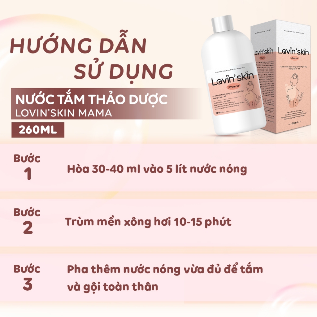 Trên đây là các thông tin cơ bản về sản phẩm Nước tắm thảo dược cho phụ nữ sau sinh hương cam sả Lovin’Skin Mama. Hy vọng bài viết trên đã cung cấp đủ các thông tin tổng quan về sản phẩm và giúp mẹ có thêm một lựa chọn an toàn hiệu quả để chăm sóc làn da của mình.