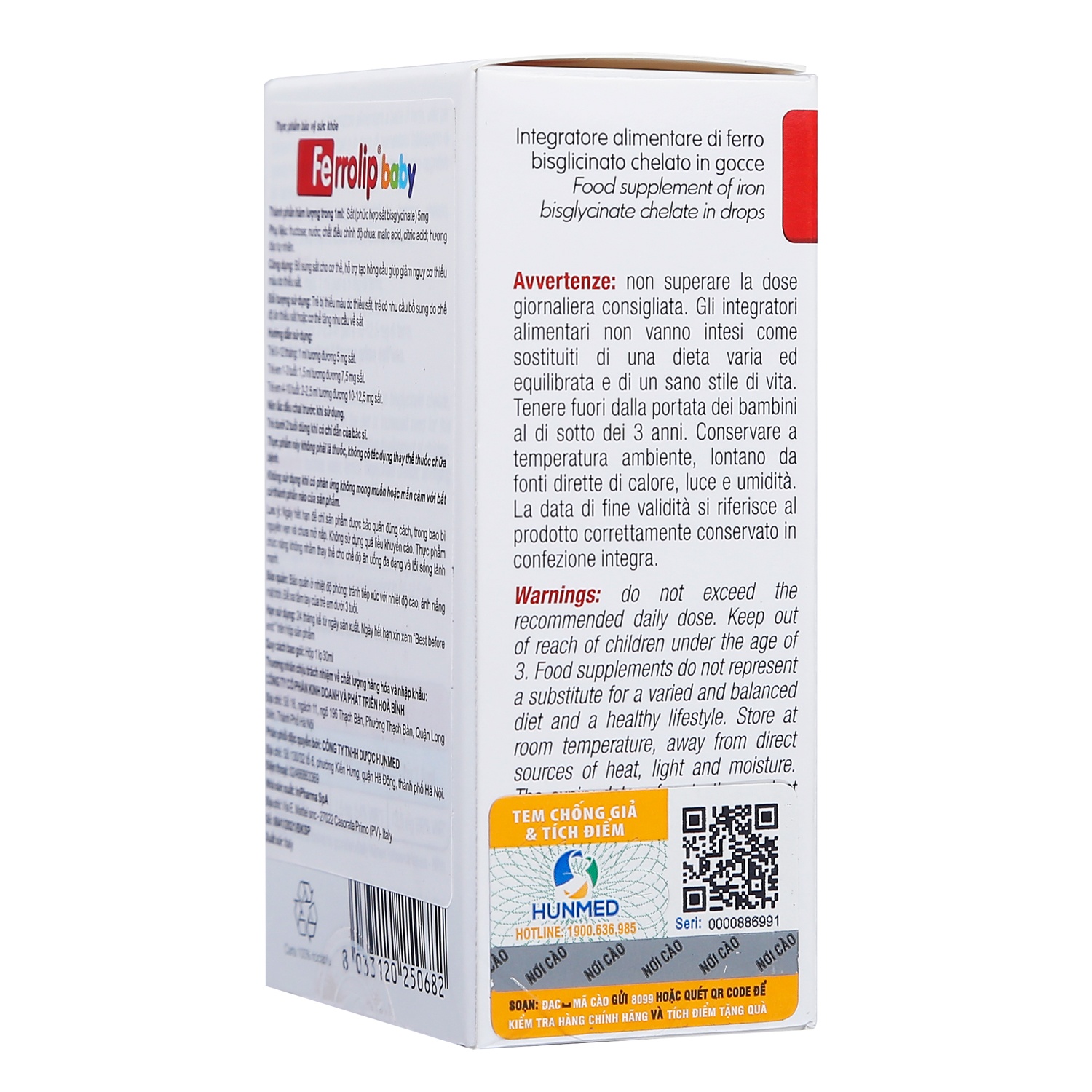 - Vitamin tổng hợp cho bé Ferrolip Baby chứa Sắt hữu cơ – Sắt Chelat Bisglycinate (Sắt amin) dễ hấp thu, mỗi 1ml tương đương 5mg Sắt nguyên tố.