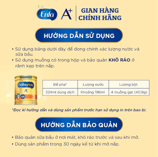 Kết hợp công thức bổ sung DHA, ARA, Choline và các vi chất dinh dưỡng thiết yếu cho chế độ ăn hàng ngày, giúp trẻ 1-3 tuổi tăng cân; chiều cao đạt chuẩn. Enfa A+ là thương hiệu thuộc tập đoàn Mead Johnson Nutrition đến từ Hoa Kỳ.