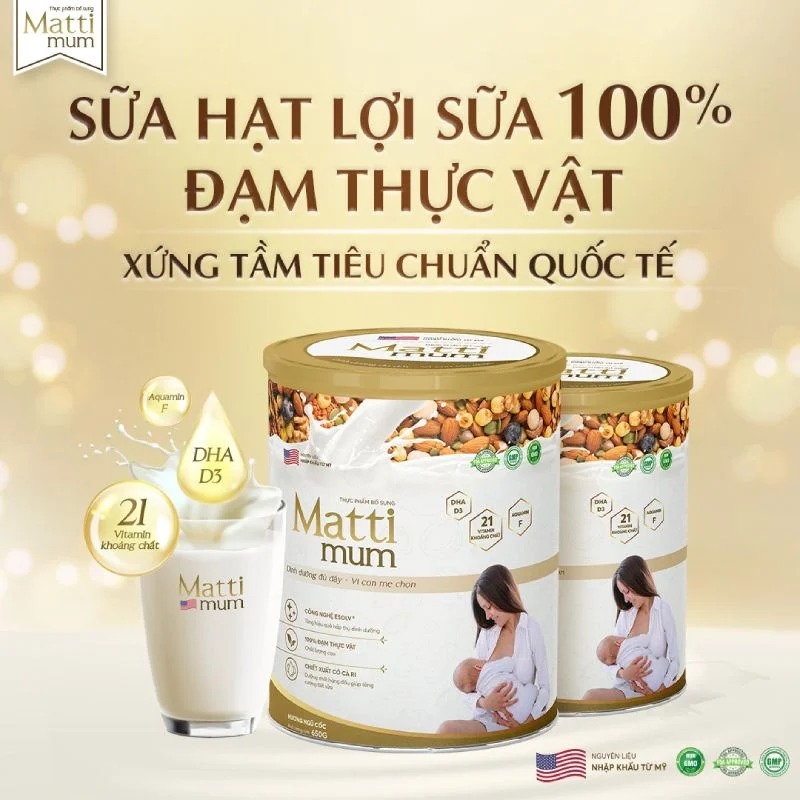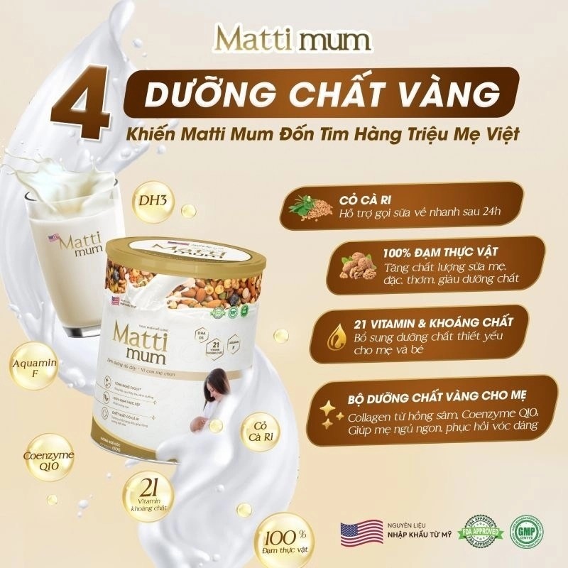 Sữa hạt lợi sữa Matti Mum là giải pháp dinh dưỡng toàn diện cho mẹ sau sinh, được đặc chế với công thức độc đáo hoàn toàn từ đạm thực vật, kết hợp cùng các loại hạt dinh dưỡng cao cấp và chiết xuất cỏ cà ri giúp tăng cường chất lượng và sản lượng sữa mẹ.