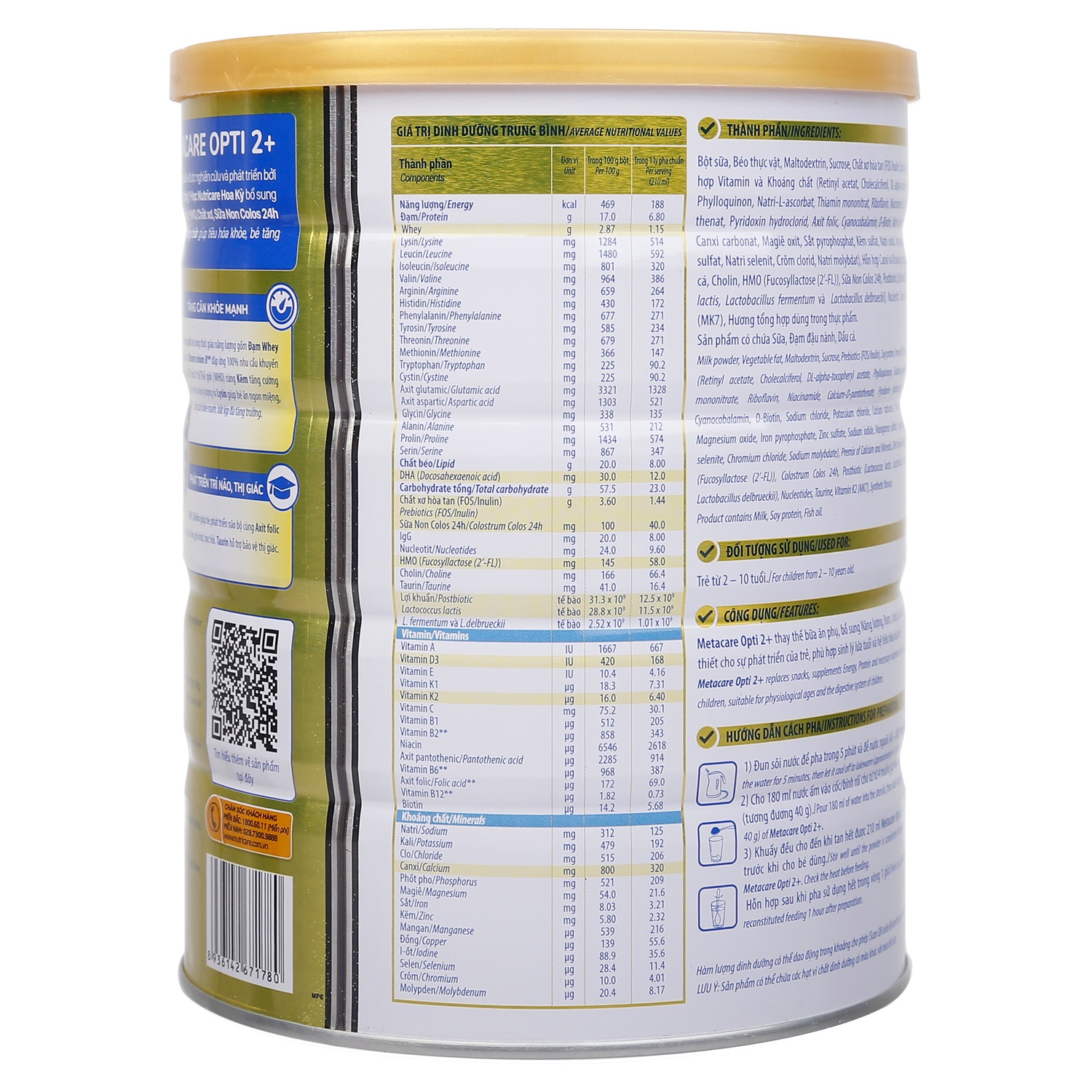 Thành phần sữa bột Metacare Opti 2+ 850g cho bé