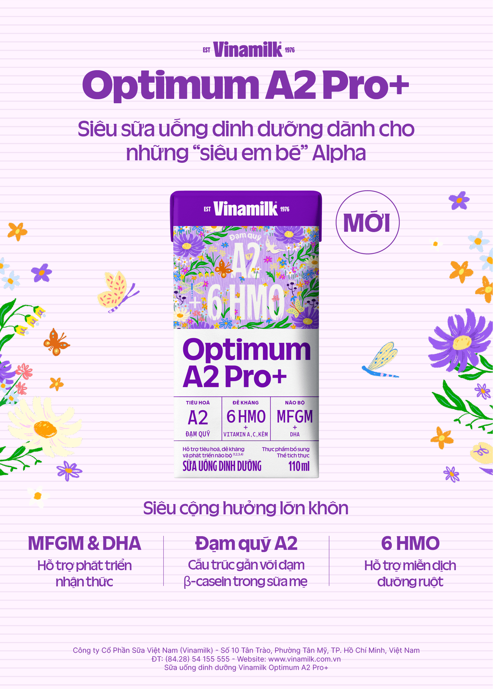Siêu sữa uống dinh dưỡng Optimum A2 Pro+ đánh dấu bước đột phá mới với Bộ 3 dưỡng chất cao cấp: Đạm quý A2 giúp tiêu hoá khoẻ, 6 HMO củng cố hàng rào miễn dịch cùng MFGM + DHA hỗ trợ phát triển trí não.