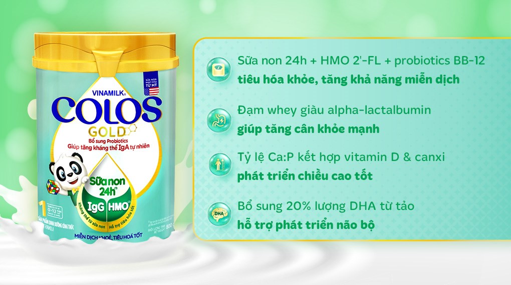 Sữa bột Vinamilk ColosGold được phát triển với công thức đặc biệt bổ sung sữa non trong suốt 24 giờ. Điều này giúp cung cấp cho bé các kháng thể IgG, probiotics và HMO (2’-FL), tạo điều kiện tốt cho vi khuẩn có lợi trong ruột. Sản phẩm cũng chứa 37 dưỡng chất, vitamin và khóang chất để hỗ trợ sự tăng cường kháng thể, tăng cân khỏe mạnh của bé cũng như phát triển não bộ cho bé.