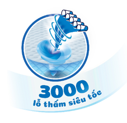 Cấu tạo bề mặt đột phá lên tới 3.000 lỗ thấm hút siêu nhanh, thoáng khí hơn gấp 3 lần, cùng công nghệ Rãnh Thấm Kim Cương cho tã mỏng, luôn khô thoáng.