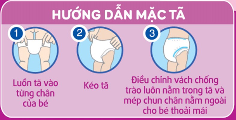 - Bước 1: Để mặc tã, kéo tã lên phía trên chân bé sao cho vùng thun hông và eo không bị gập lại. Điều chỉnh tã cho bé vừa vặn, thoải mái