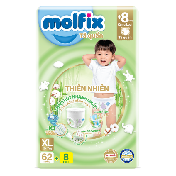 Tã quần Molfix thiên nhiên (XL, 12-17kg, 62 miếng là sản phẩm dành cho trẻ có cân nặng 12 -17kg. Với thành phần sợi tre tự nhiên và bông Organic, Molfix Thiên Nhiên là dòng sản phẩm đột phá từ nhà sản xuất tã trẻ em lớn thứ 5 thế giới dành riêng cho thị trường Việt Nam.