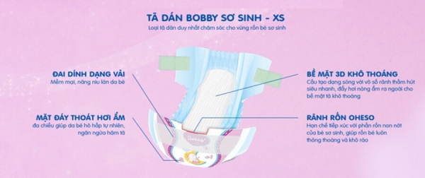 Tã dán Bobby siêu thấm - khô thoáng êm mềm khô thoáng cải tiến mới với cấu tạo bề mặt đột phá hơn 4,000 lỗ thấm hút siêu nhanh, thoáng khí hơn gấp 2 lần, cùng chất liệu Cotton-soft bổ sung Cream Vitamin E dịu nhẹ, ngừa hăm, tốt nhất cho làn da non nớt của trẻ sơ sinh.