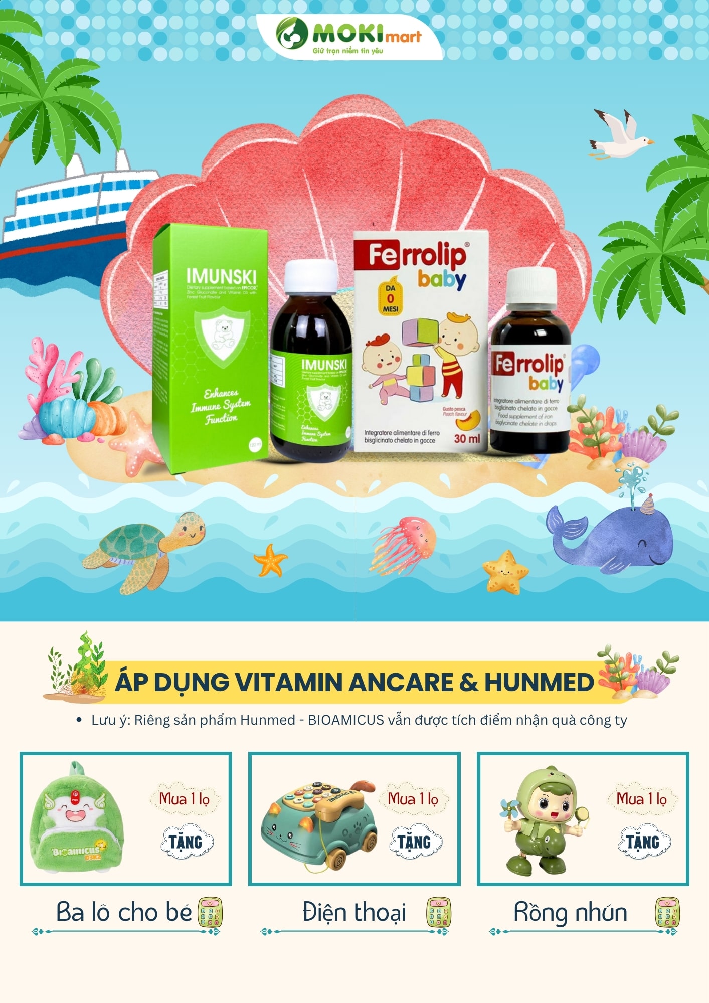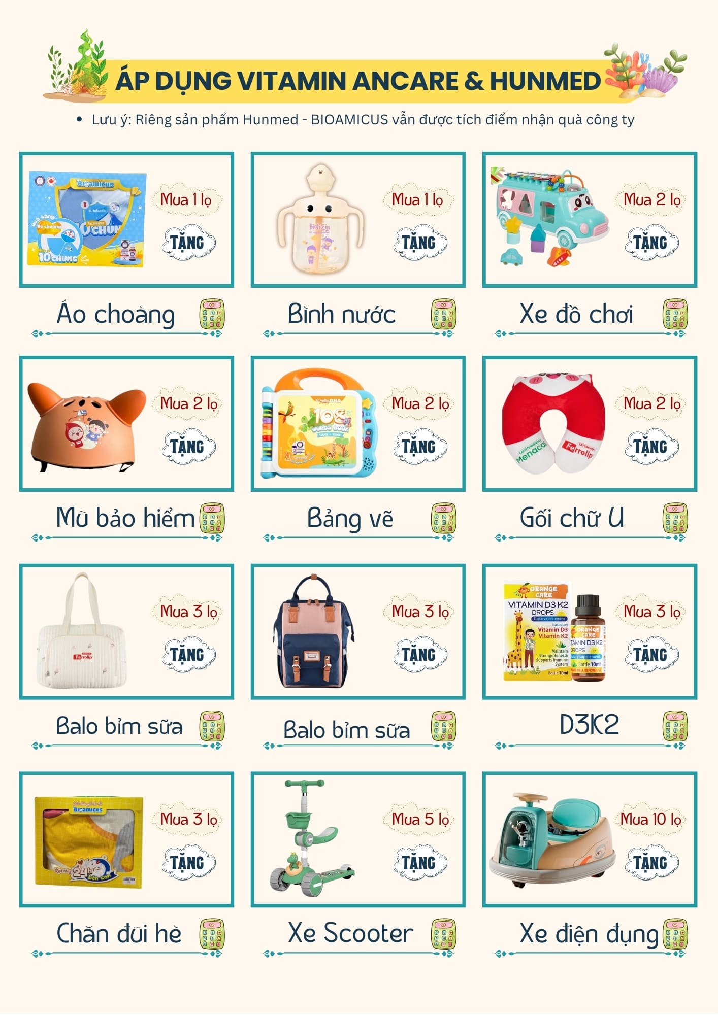 Các sản phẩm nổi bật trong chương trình gồm: Imunski, Ferrolip Baby, D3K2, Bioamicus,..., phù hợp với nhiều giai đoạn phát triển của trẻ nhỏ.