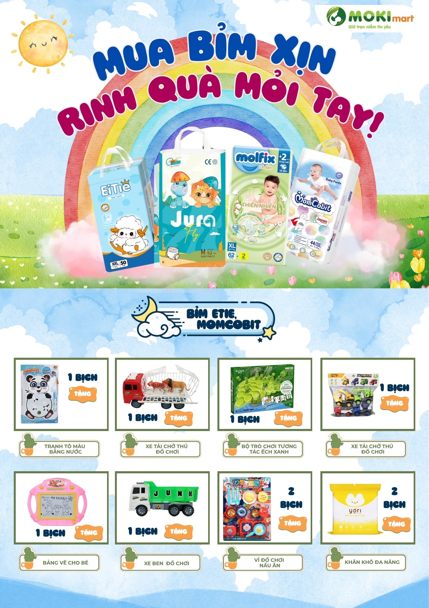 Đặc biệt, khi mẹ mua sản phẩm thuộc chương trình, Moki sẽ dành tặng nhiều phần quà dễ thương, thiết thực như: