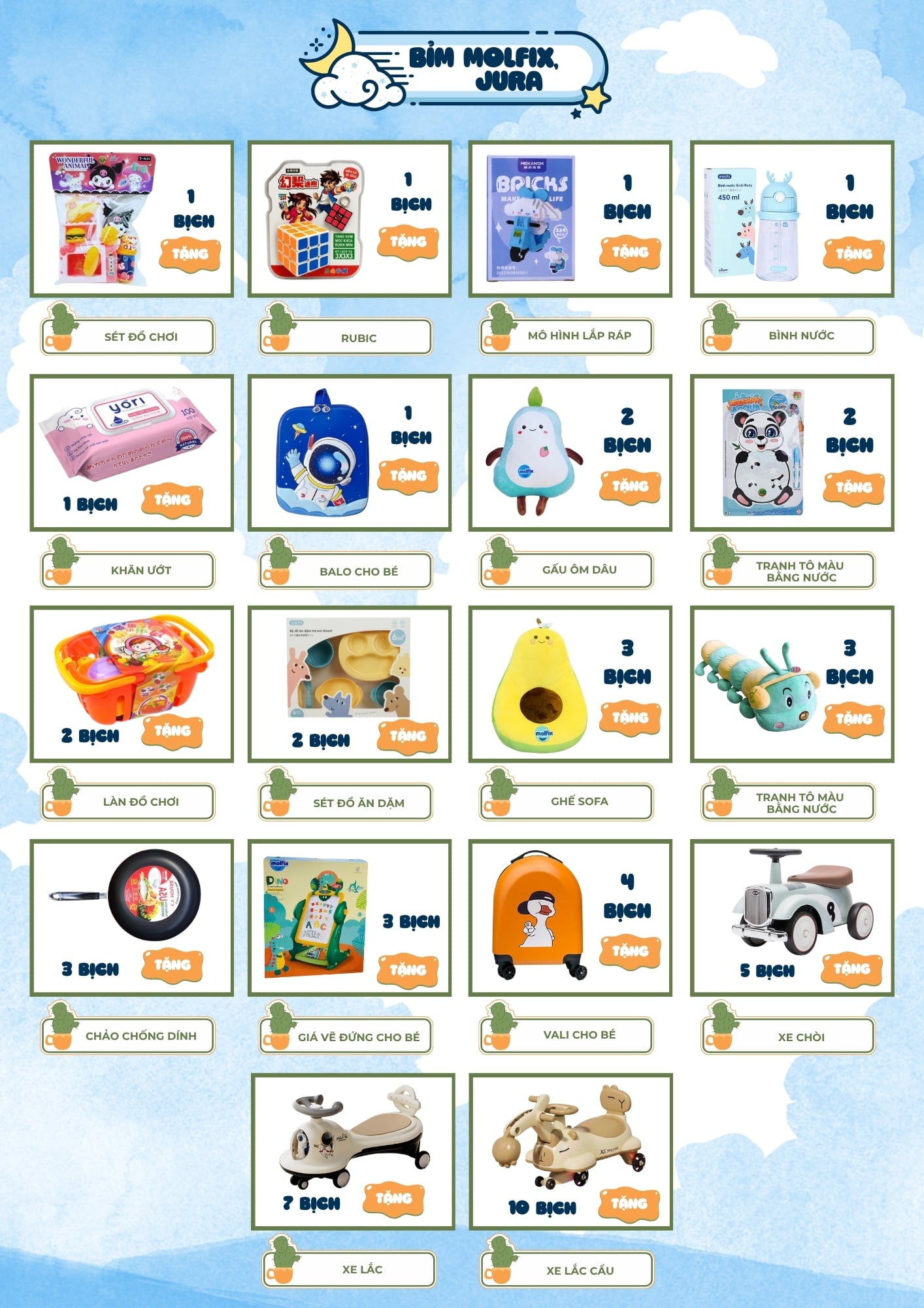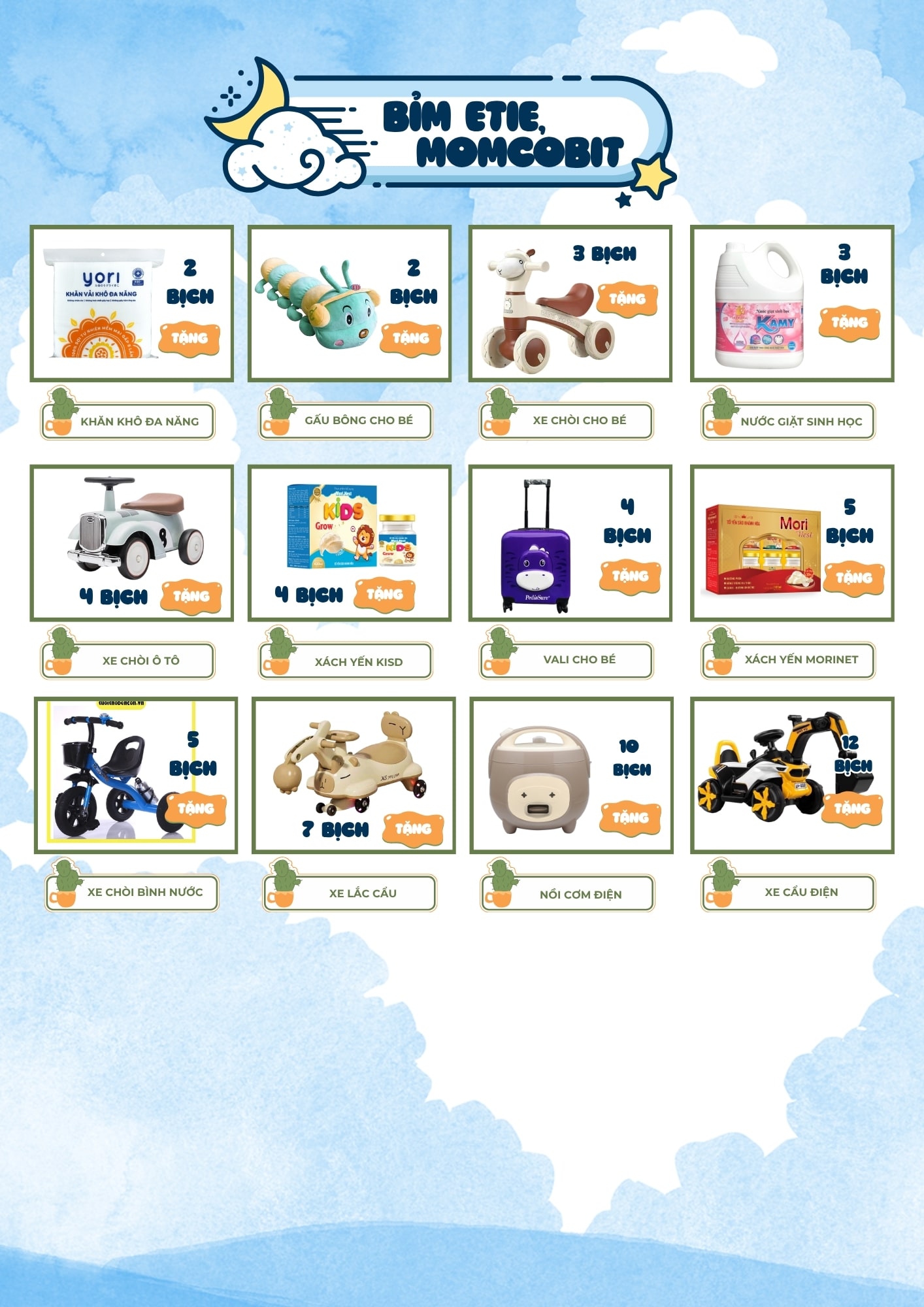 Tùy theo số lượng sản phẩm mẹ chọn, phần quà sẽ được đổi linh hoạt và minh bạch, đảm bảo bé thích – mẹ vui.