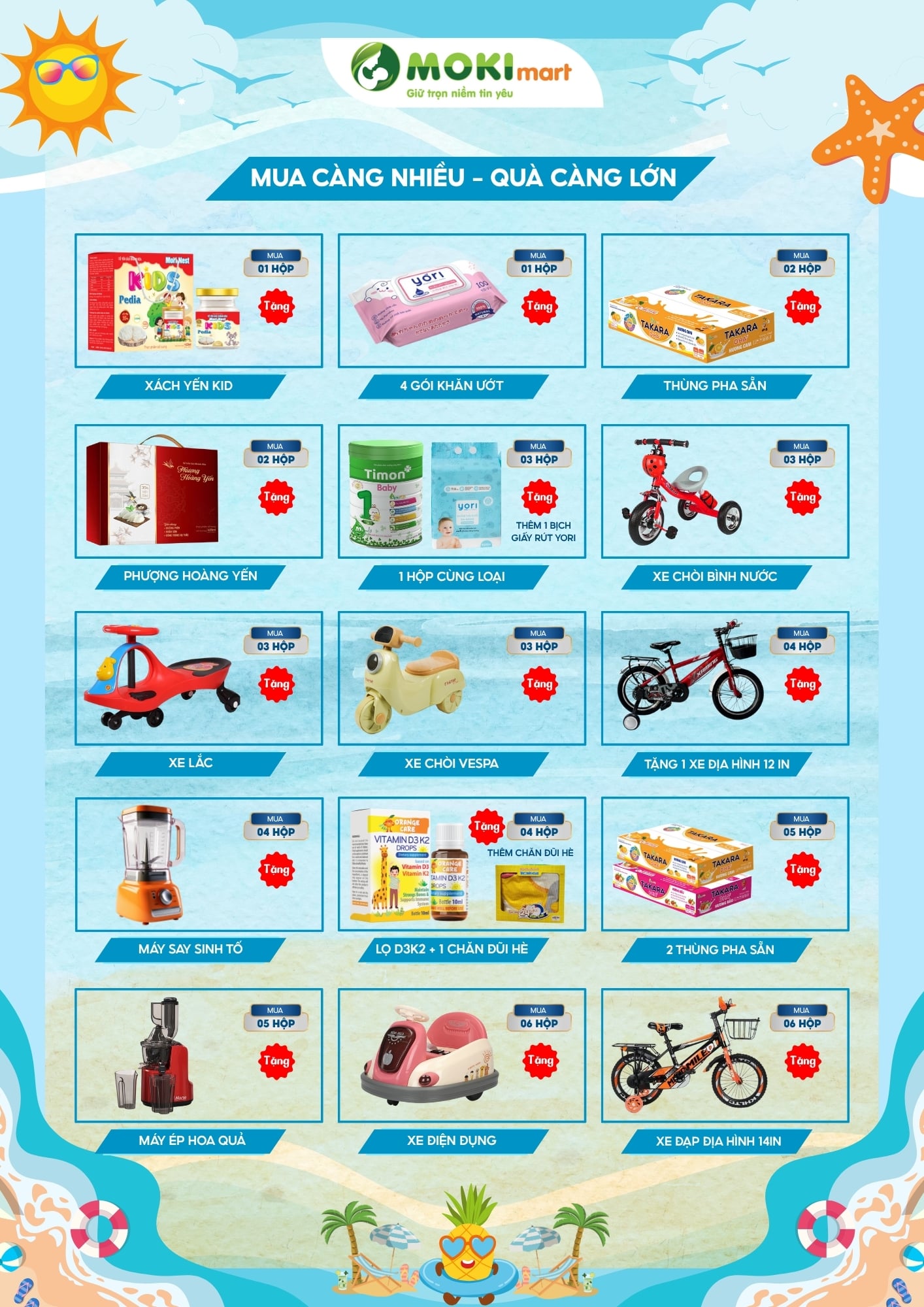 Không chỉ là mùa mua sắm, hè này còn là mùa của những món quà bất ngờ tại Moki Mart. Chương trình ưu đãi áp dụng cho loạt sản phẩm thiết yếu như sữa bột, vitamin – thực phẩm tăng đề kháng, và cả bỉm cho bé. Mỗi sản phẩm đều đi kèm quà tặng hấp dẫn theo số lượng mua, từ những món đồ nhỏ xinh đến những phần thưởng giá trị như xe chòi, máy ép hoa quả hay thậm chí là xe ô tô điện cho bé yêu.