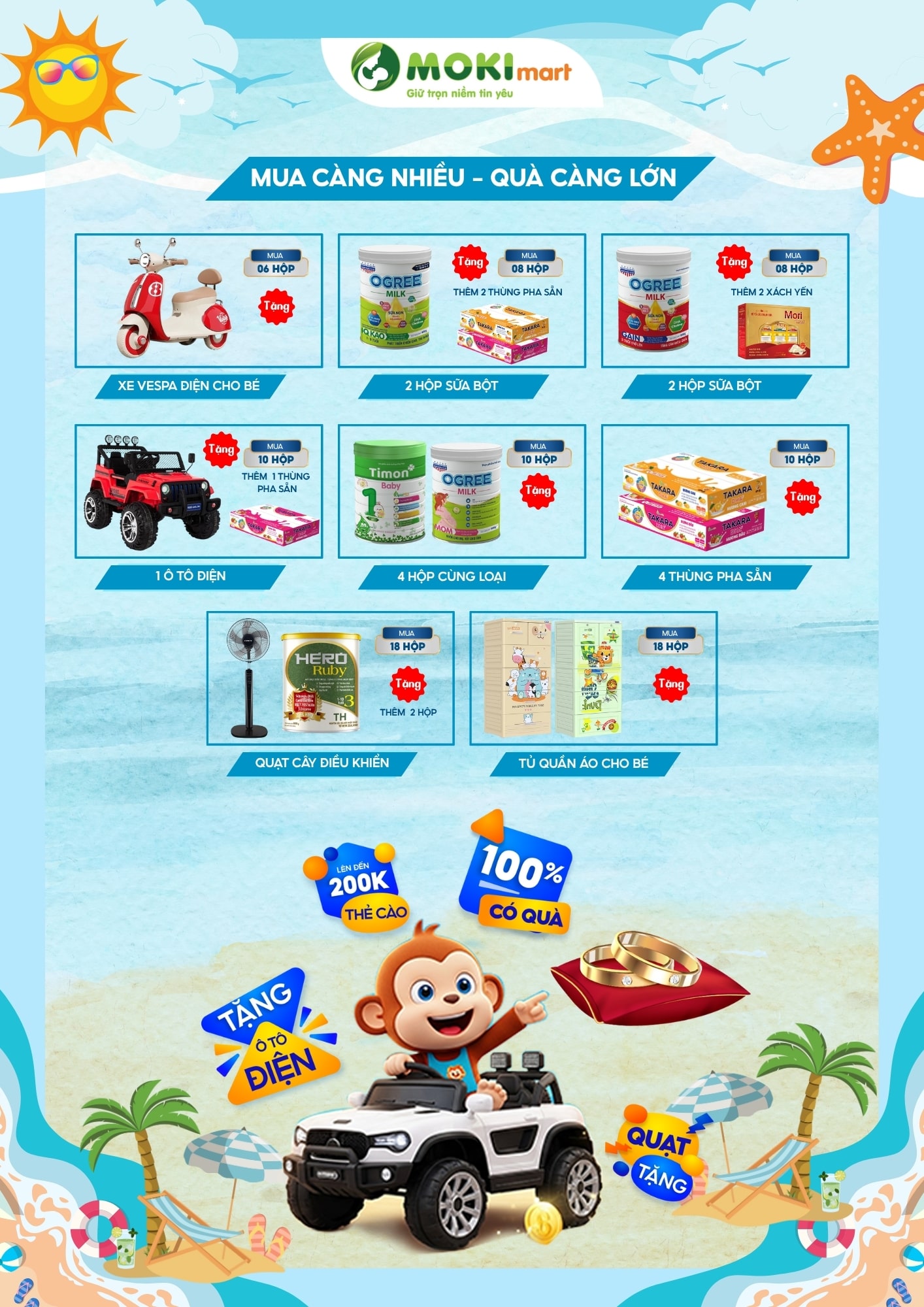 Bên cạnh hàng loạt quà tặng hấp dẫn theo số lượng hộp, khách hàng khi mua sữa bột tại Moki Mart còn được tham gia chương trình thẻ cào trúng thưởng 100%, với cơ hội nhận những phần quà cực kỳ giá trị: