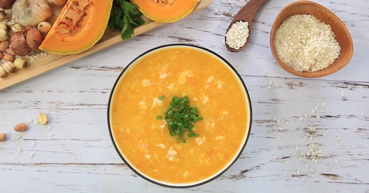- Bí đỏ cắt nhỏ, đem hấp, rồi tán nhỏ bằng thìa và cho vào nồi cháo ninh cùng. Quấy đều tay để các loại nguyên liệu quện đều vào với nhau.